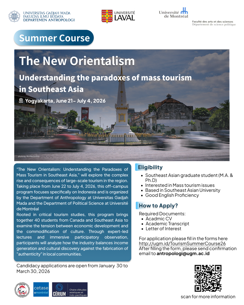 “The New Orientalism: Understanding the Paradoxes of Mass Tourism in Southeast Asia,” will explore the complex rise and consequences of large-scale tourism in the region. Taking place from June 22 to July 4, 2026, this off-campus program focuses specifically on Indonesia and is organized by the Department of Anthropology at Universitas Gadjah Mada and the Department of Political Science at Université de Montréal