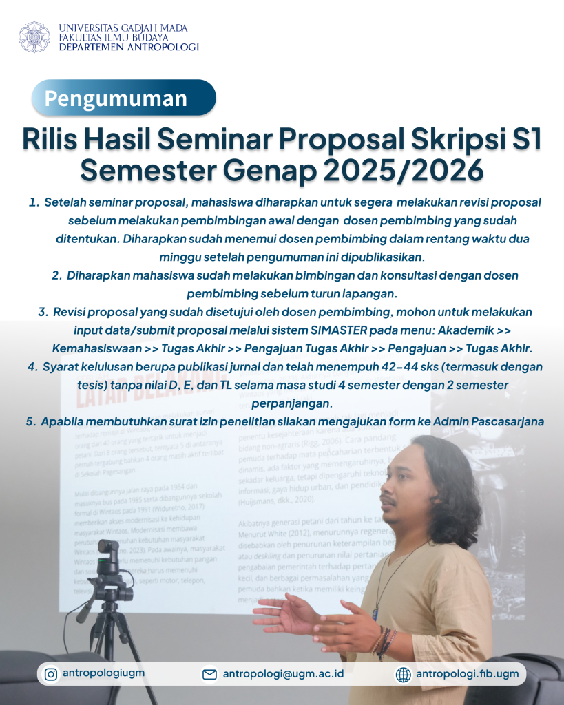 Diberitahukan kepada mahasiswa S2 Antropologi yang sudah mengikuti Seminar Proposal Tesis pada 16 April 2026, berikut kami informasikan tentang pembagian daftar mahasiswa bimbingan beserta dengan dosen pembimbing tesis: