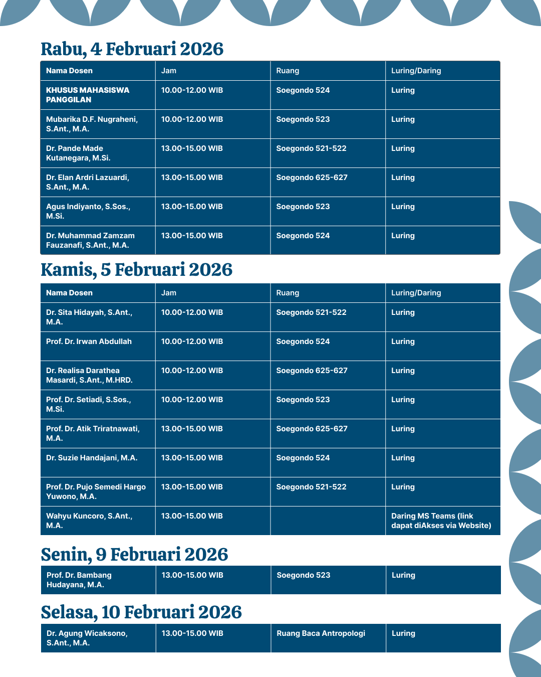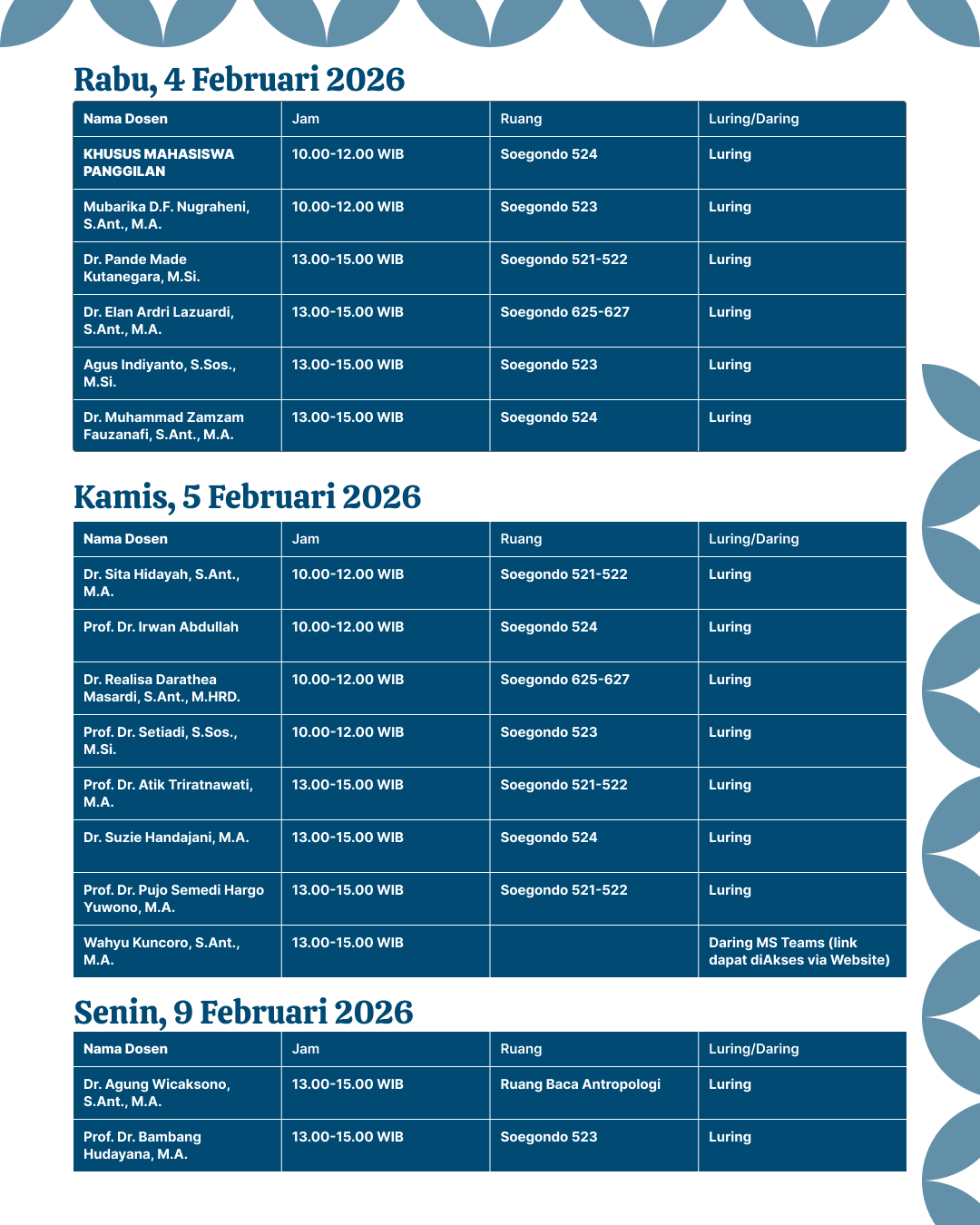 Diberitahukan kepada seluruh mahasiswa aktif S1 Antropologi Budaya, Departemen mengadakan acara temu Mahasiswa dengan Dosen Pembimbing Akademik (DPA) untuk memfasilitasi dan mempermudah komunikasi antara mahasiswa dengan dosen pembimbing. Pertemuan ini penting dan kami harapkan mahasiswa dapat hadir secara langsung/tatap muka dengan dosen pembimbing akademiknya. Jadwal dan pembagian ruang sebagai berikut: