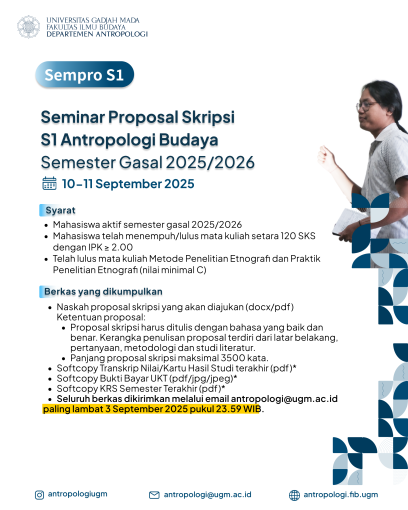 Departemen Antropologi, Fakultas Ilmu Budaya, Universitas Gadjah Mada akan menyelenggarakan Seminar Proposal Skripsi (Sempro) S1 Antropologi Budaya Semester Gasal 2025/2026 pada: